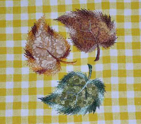 Az applikációhoz ( azaz minden falevélhez) mindig más anyagot használtam, de mindig ugyanazt a három melírozott Gütermann hímzőcérnát. Nagyon tetszett a cérna, ill a véletlenszerűsége.