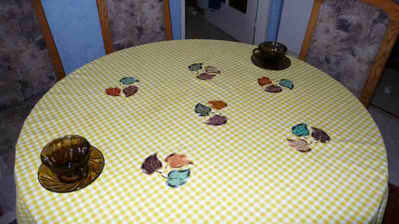 Már elég régóta érett bennem a gondolat, hogyan is alakítsam át az egyik asztalterítőnket, amit egy előző kreatív időszakomban sikeresen összefestettem. A sárga terítőn a szép fekete foltokat természetesen semmilyen csodamosóporral nem tudtam kimosni, így maradt a másik megoldás, applikáltam rá faleveleket. Na, ez tökéletes megoldás volt, egyik folt sem látszik!