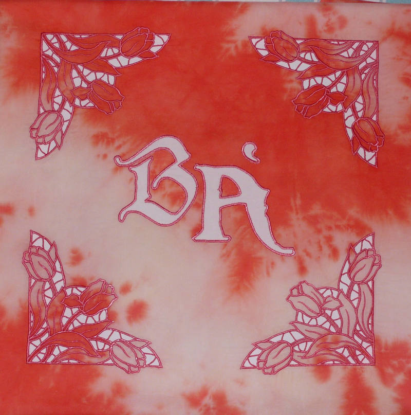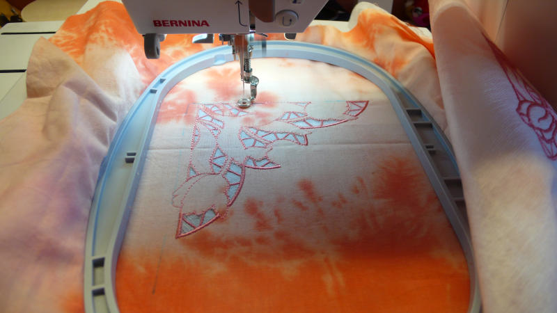 A lényege, hogy a hímzés elején a gép ‘felrajzolja’ azokat a részeket amiket ki kell vágni és utána szépen körbevarrogatja apró szatén öltésekkel.