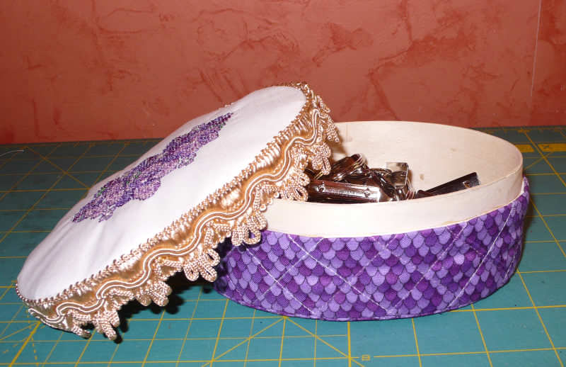 Először nem akartam belekeverni egy újabb színt, de mégis ez a bortni tűnt a legjobb választásnak. A tetejében is, oldalában is van egy kis vatelin, így lett ilyen kis pufók.:o))) A dobozka nem nagy, kb. 15 x 6cm-es.