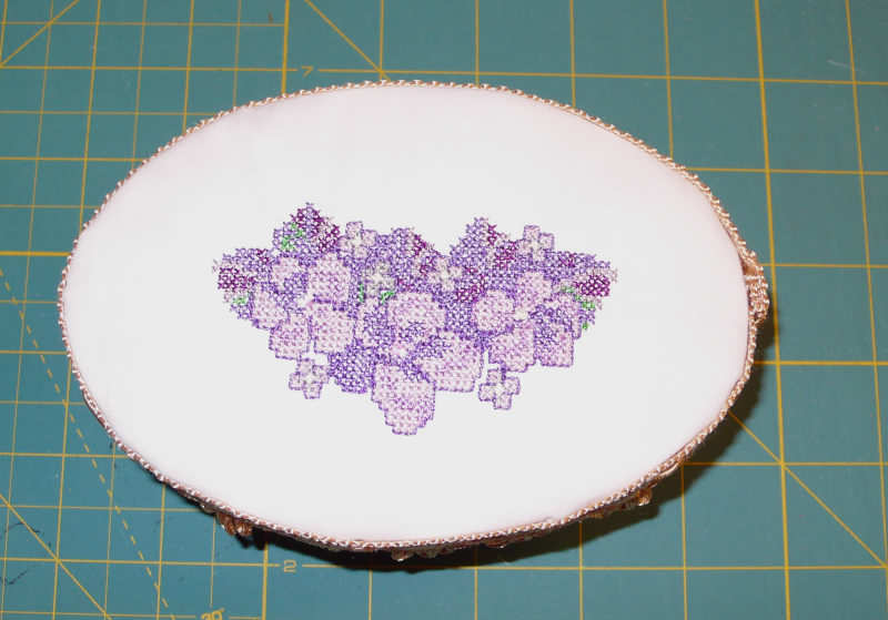 Az idén el is jutottam odáig, hogy hímeztem egy próbát, amin épp ibolyák vannak. Hát nem sikerült valami jól (a színekkel van gond) de talán ide jó lesz.