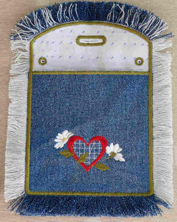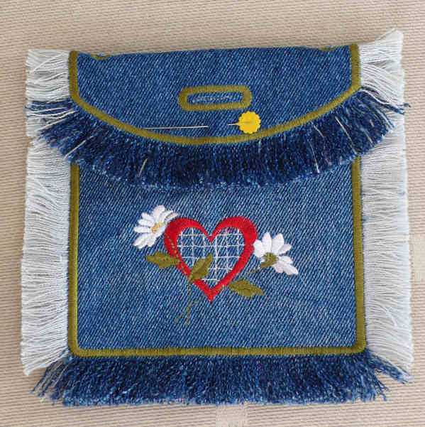 Egy kidobásra szánt farmer nadrág (a nem elasztikus változat) szárából készült. Mivel a kis szütyő nem nagy, jó pár kijön egy nadrágból. Kipróbáltam a rojtos verziót és a sima hímzett szélűt is.