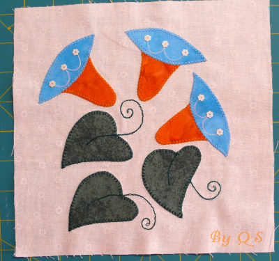 A másikblokk már izgalmasabb, szintén applikáció, mégpedig ‘UDA= Upside down appliqué‘.