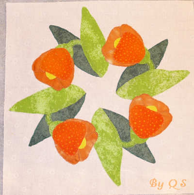 Ez egy egyszerű ‘fusible appliqué’, azaz ragasztós technikával készült, majd gépi pelenkával -saját színével- körbevarrtam. A méret adott, 20 x 20cm. Előre kiszabtam az összesnek az alapot. Így mind egyforma hátterű lesz.