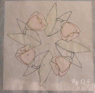 Megmutatom a hátsó felét is. Ennél a technikánál erről az oldalról varrjuk a virágot. A stabilizátorra felrajzolt minta segítségével. Kimondottan alkalmas a sok viszonylag pici darabból álló blokkokhoz.