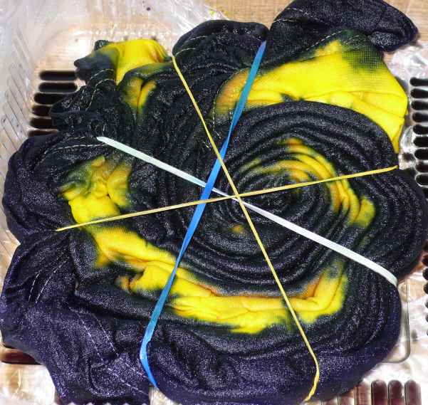 Egyből két színben is festettünk, bíztunk benne, hogy jól sikerül. Kiindulás a hosszában félbehajtott pólóból, majd kb. a középen összecsípve elkezdjük spirál alakban összetekerni.