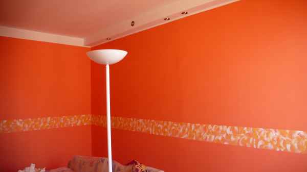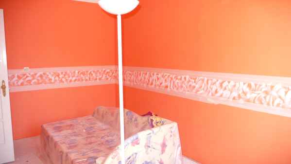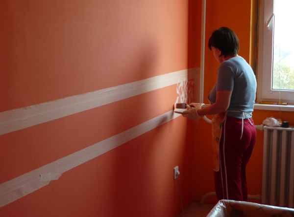 Hogy ne legyen olyan egyhangú az egész, azt találtam ki, hogy festek egy bordűrt én sk!! Először is meghatároztam a magasságát, szélességét és a maszkoló ragasztóval feljelöltem a helyét. Csak azokat a színeket használtam, amit a szoba festésénél , tehát a sárgát, fehéret és a terracottát. A díszcsíkot a fehérrel kezdtem…