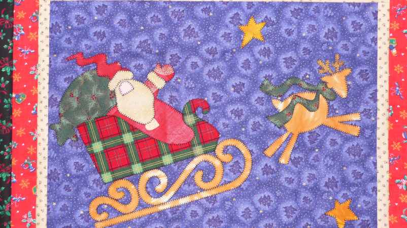 A technika a szokásos, ‘fusible appliqué’, azaz ragasztásos applikáció. Miután felvasaltam az elemeket, fekete cérnával (alul, felül) gépi pelenkaöltéssel körbevarrtam. Nekem nagyon tetszik, szépen sikerült. Ennek a titka, hogy szépen lassan kell varrni, a tű lent marad az anyagban forduláskor, hogy az öltések szépek legyenek. Ezen a közelin, talán kicsit jobban látszik.